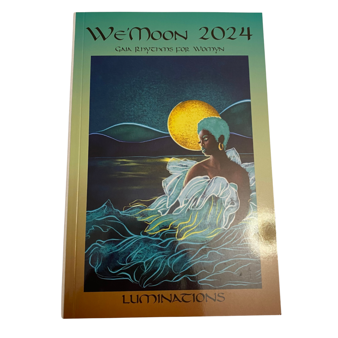 We'Moon 2024: Luminationsinvokes the Waxing Half Moon: She dwells in the creative balance of equal Shadow and Light, and takes us along the mysterious edge where obstacles meet invention, and visions spark magic. This datebook is a stunning weave of art and writing from women offering radiant wisdom, passionate earth-devotion, love miracles, inventive joy-alarm and outcry! Come along; relish growth, embrace confidence and invite heartful creativity with this Luminations theme. May the blessings of Luminations inspire us each and every day of the coming year!